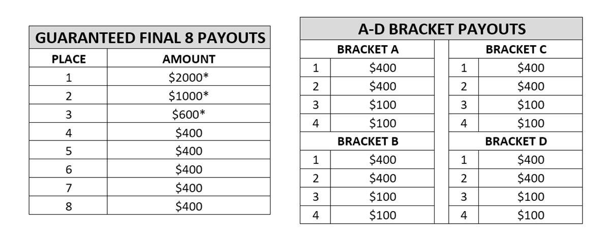 Bracket A and B will be the first to compete. We’ll run through both brackets at the same time. There will be no battle for 3 or 4 as the prize money they receive is the same and they do not advance. Then we will move onto Bracket C and D. First and second place are the only positions that will advance so it is critical that you finish in the top 2 if you want to move on in the event.